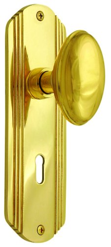 Nostalgic Warehouse 704434 Polished Brass Deco Plate with Homestead Knob Passage Knobset from the De